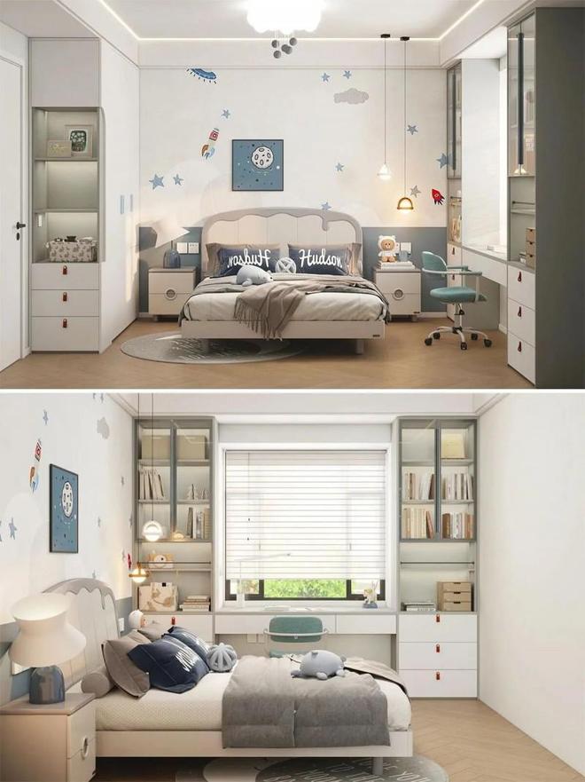 选择可调节高度的书桌、层板可移动的衣柜,墙面用磁吸板替代固定装饰,方便随年龄调整空间功能。